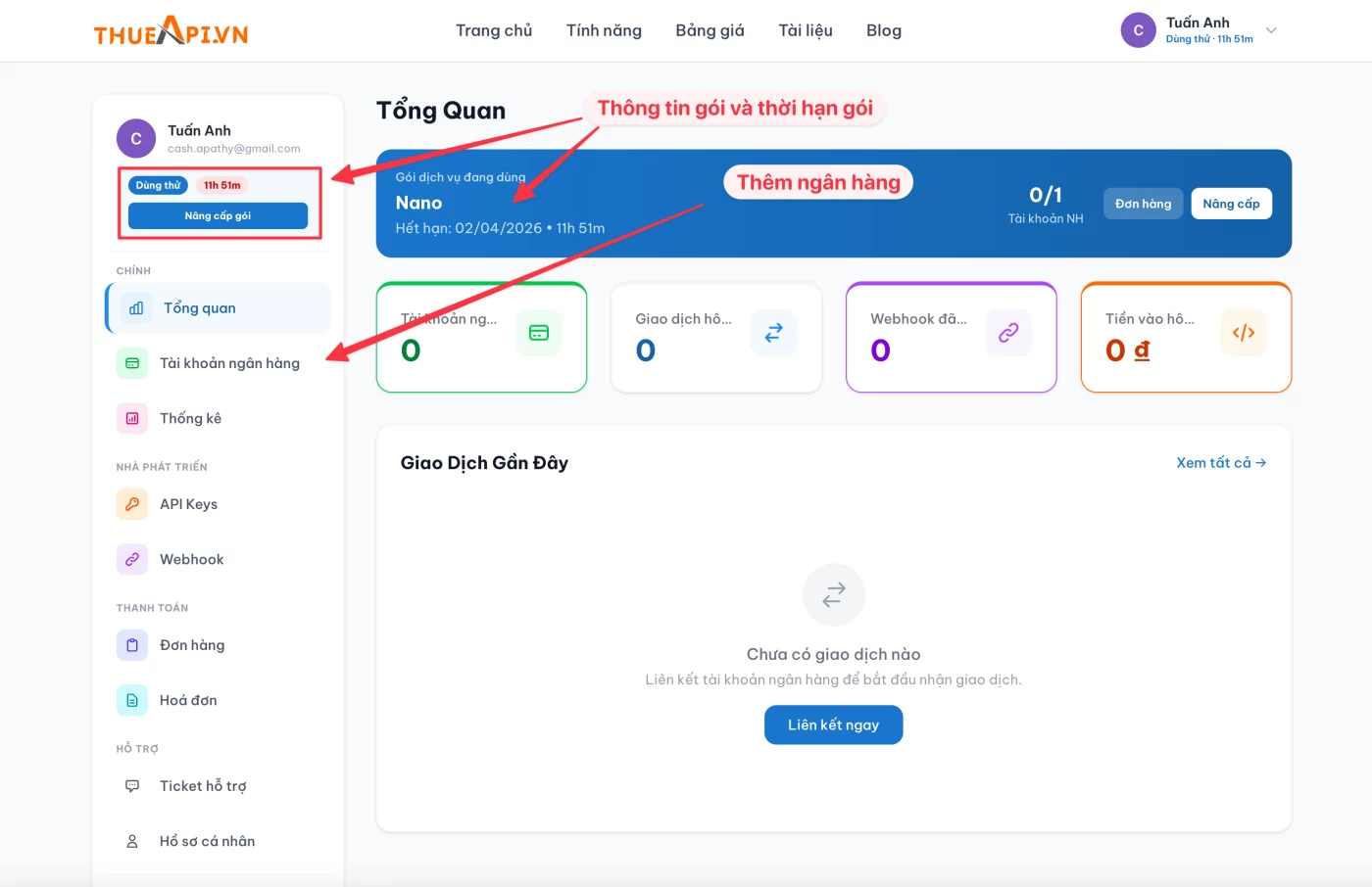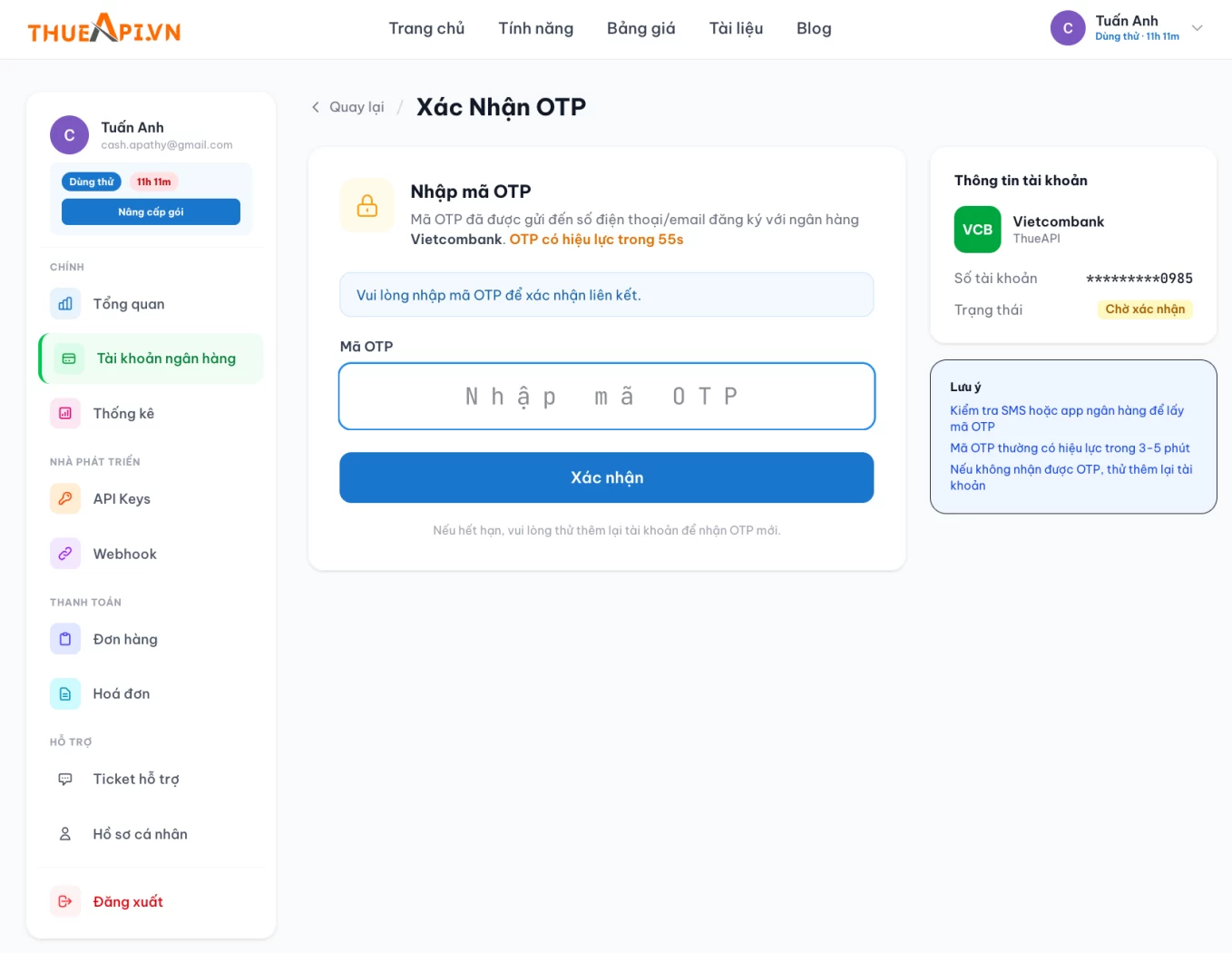 Đăng nhập ThueAPI.VN → Dashboard → Tài khoản ngân hàng → Thêm tài khoản mới