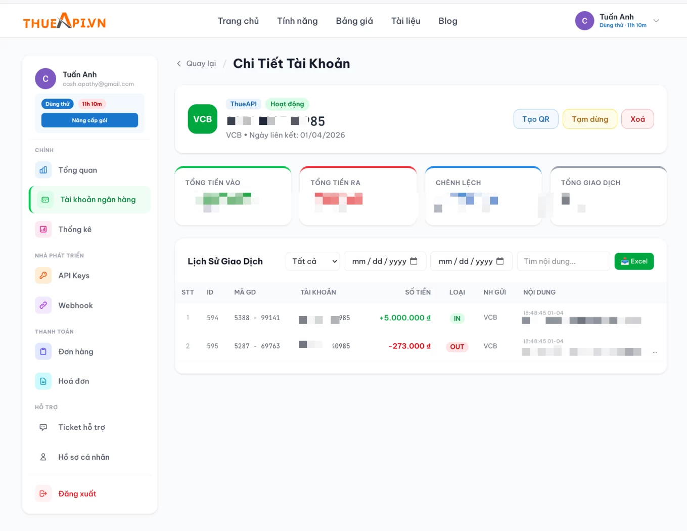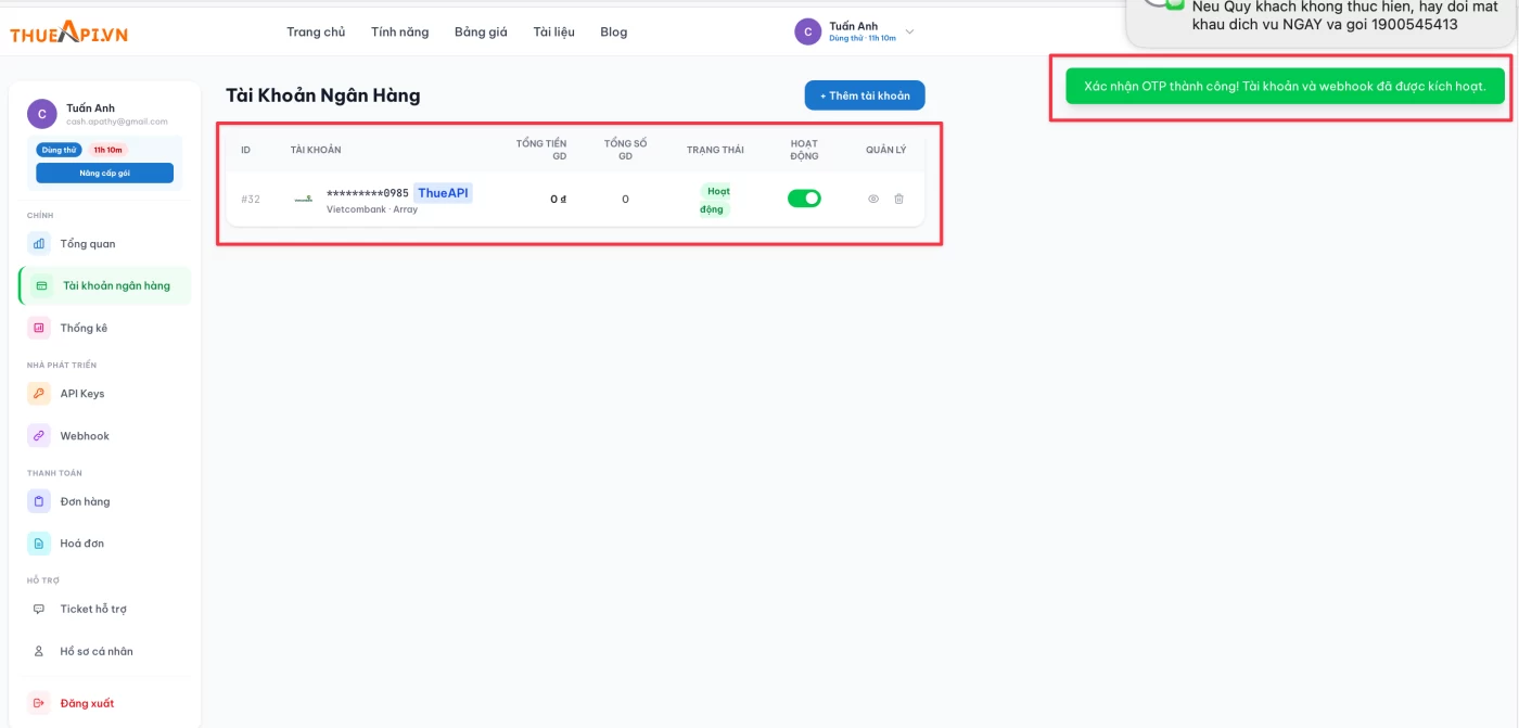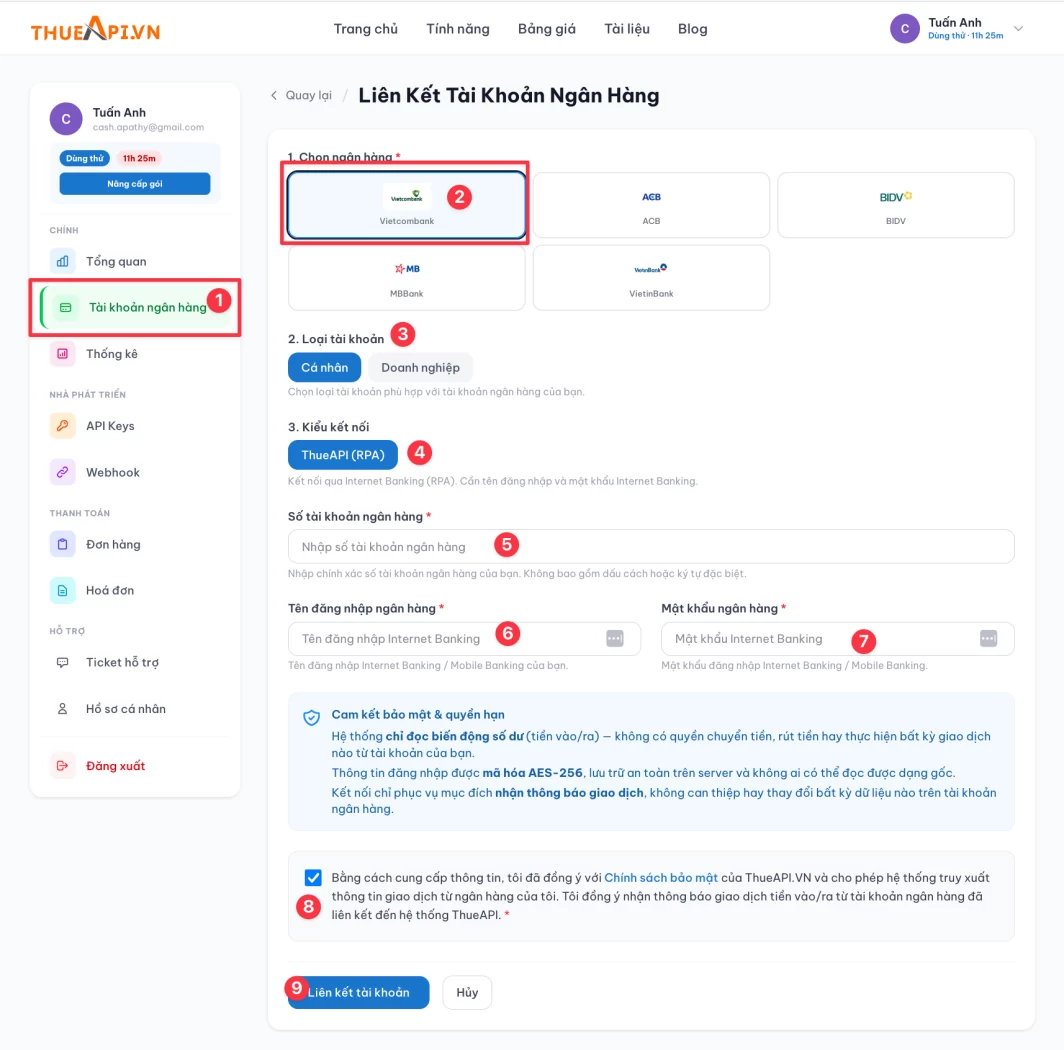 - Đổi mật khẩu: Nếu đổi mật khẩu Internet Banking, cần cập nhật lại trên ThueAPI