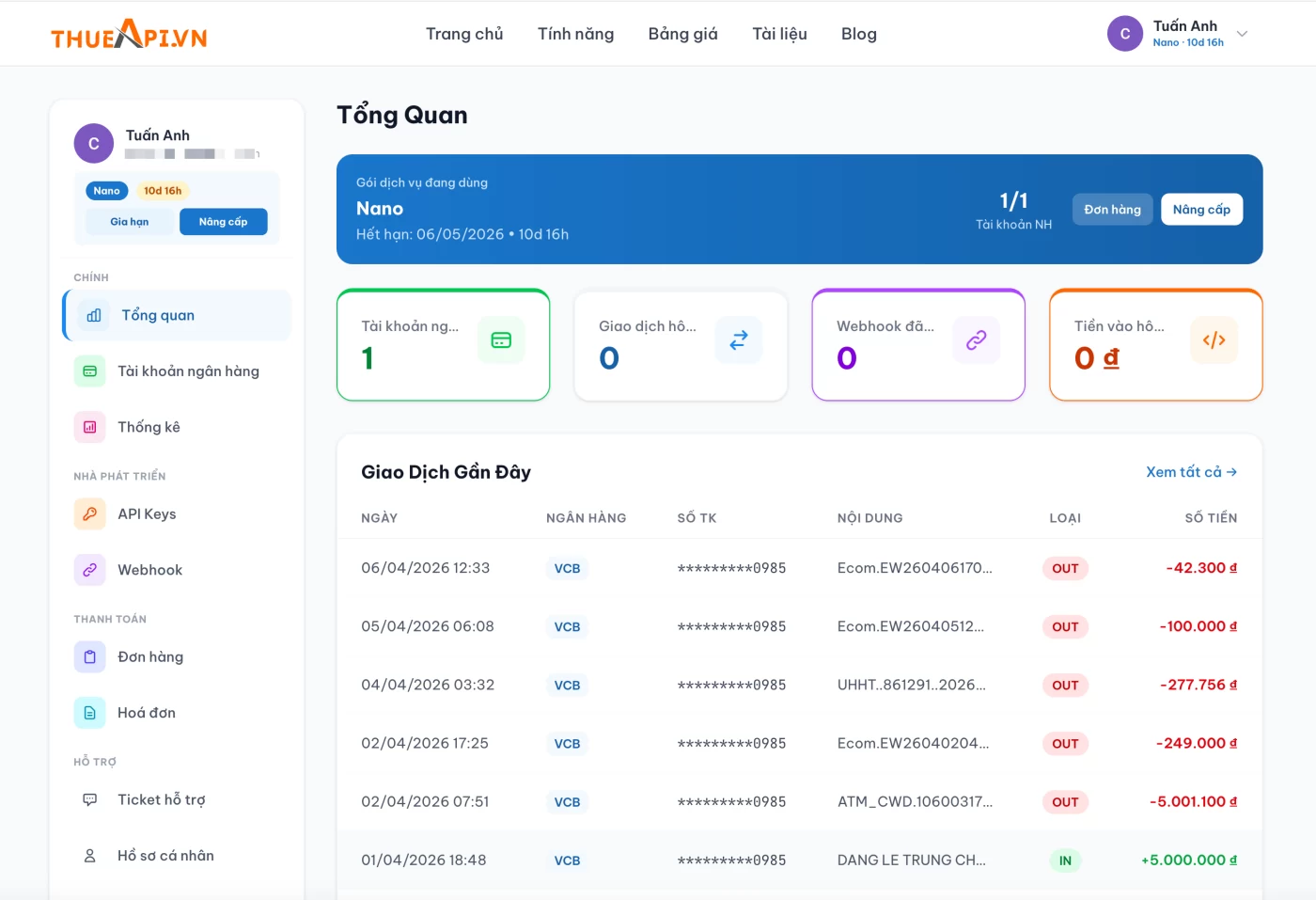ThueAPI.VN là nền tảng cho thuê API ngân hàng cung cấp giải pháp toàn diện cho việc tích hợp thanh toán tự động. Dưới đây là tổng quan chi tiết tất cả tính năng.
